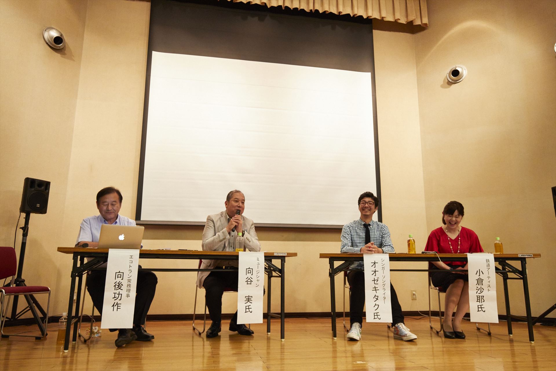 トークセッションは、「鉄道と音楽の未来」について、向後功作常務理事がコーディネーターとなって向谷実氏、シンガーソングライターのオオゼキタク氏、鉄道アーティストの小倉沙耶氏によるトークが展開されました。(以下、敬称略)