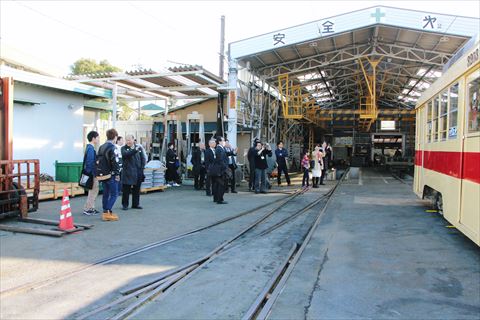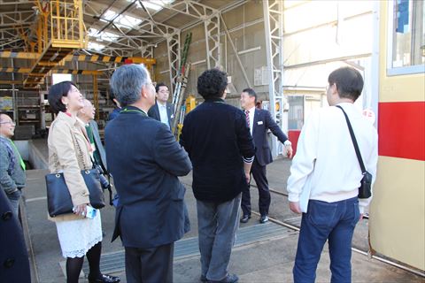 市電に乗り赤岩口車両区に移動、車両やピットのほか、1880年代のめずらしいレールの数々が現役で使われていることをご紹介いただきました。
