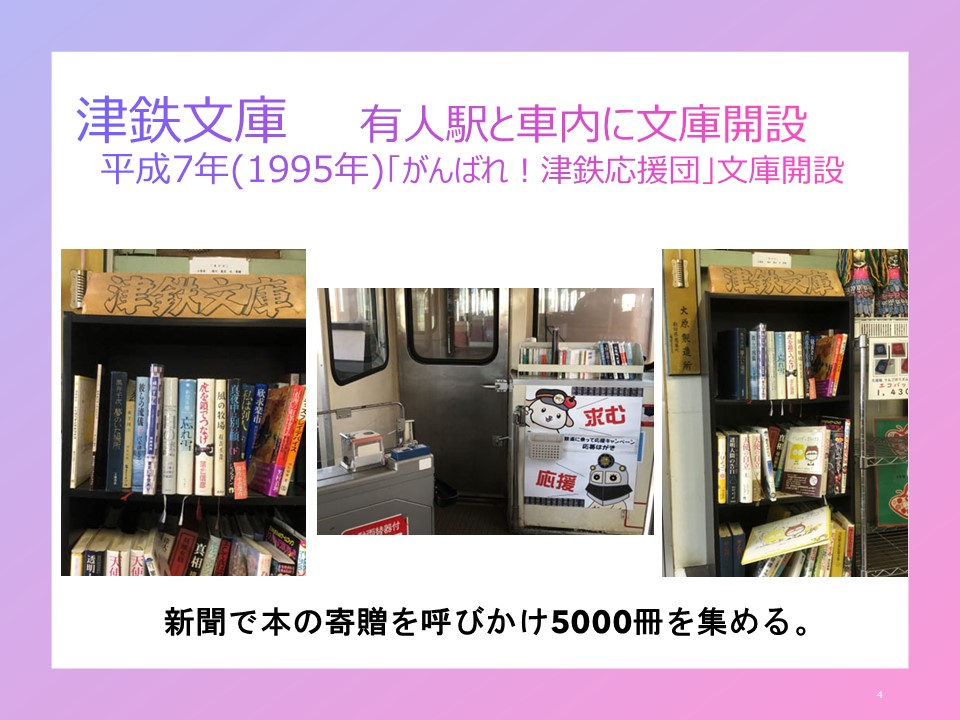 1995年に沿線有志で組織する「がんばれ津鉄応援団」が、新聞で書籍の寄贈を募り、思いもかけず5000冊の本を集めることができ、それを駅と車両内に置いて「津鉄文庫」として運営を行なってきたという実績があったのです。