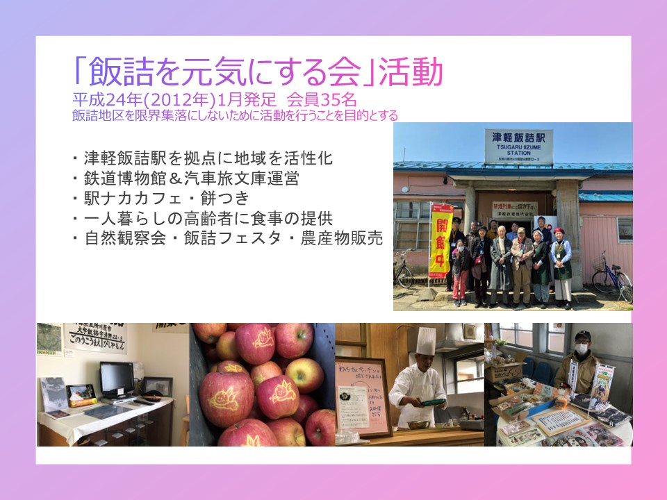 先程からお話させていただいている「飯詰を元気にする会」は、平成24年1月に発足した会員35名の会です。実は私もその会員でもありますが、目的は津軽飯詰駅周辺の飯詰地区を限界集落にしないために活動しよう、と立ち上げた会です。