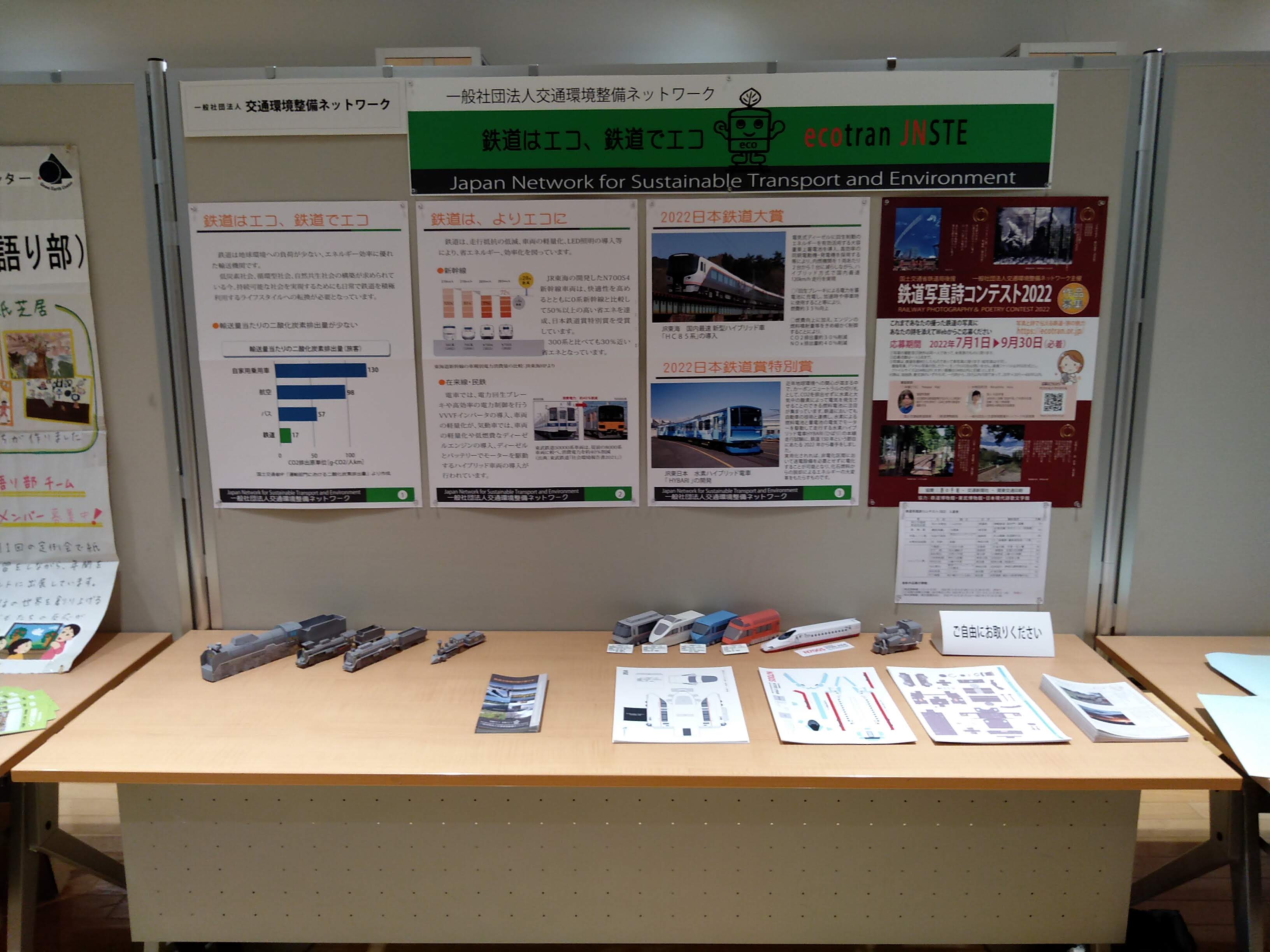 会場内のブースでは、「鉄道はエコ、鉄道でエコ、エコトラン」の標語とともに、環境に対する鉄道の優位性を発信。