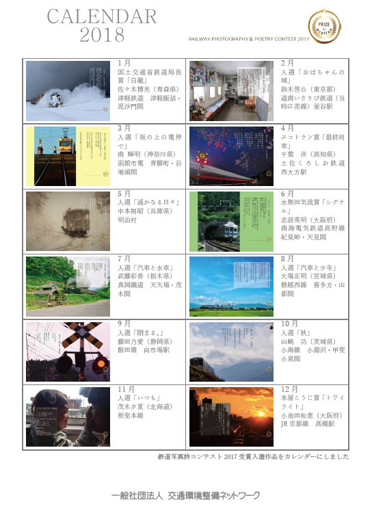 2018年のカレンダーと壁紙は、鉄道写真詩コンテスト2017の入賞及び入選作品により作成しています。